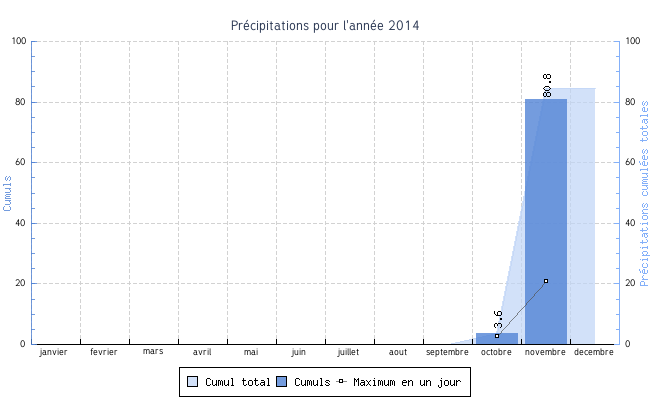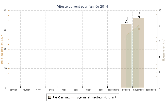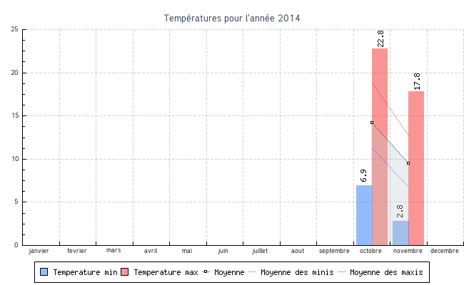 | octobre | 6.9 °C | 11.2 °C | 22.8 °C | 18.8 °C | 14.2 °C | 6.8 km/h | 33.1 km/h | SSO |